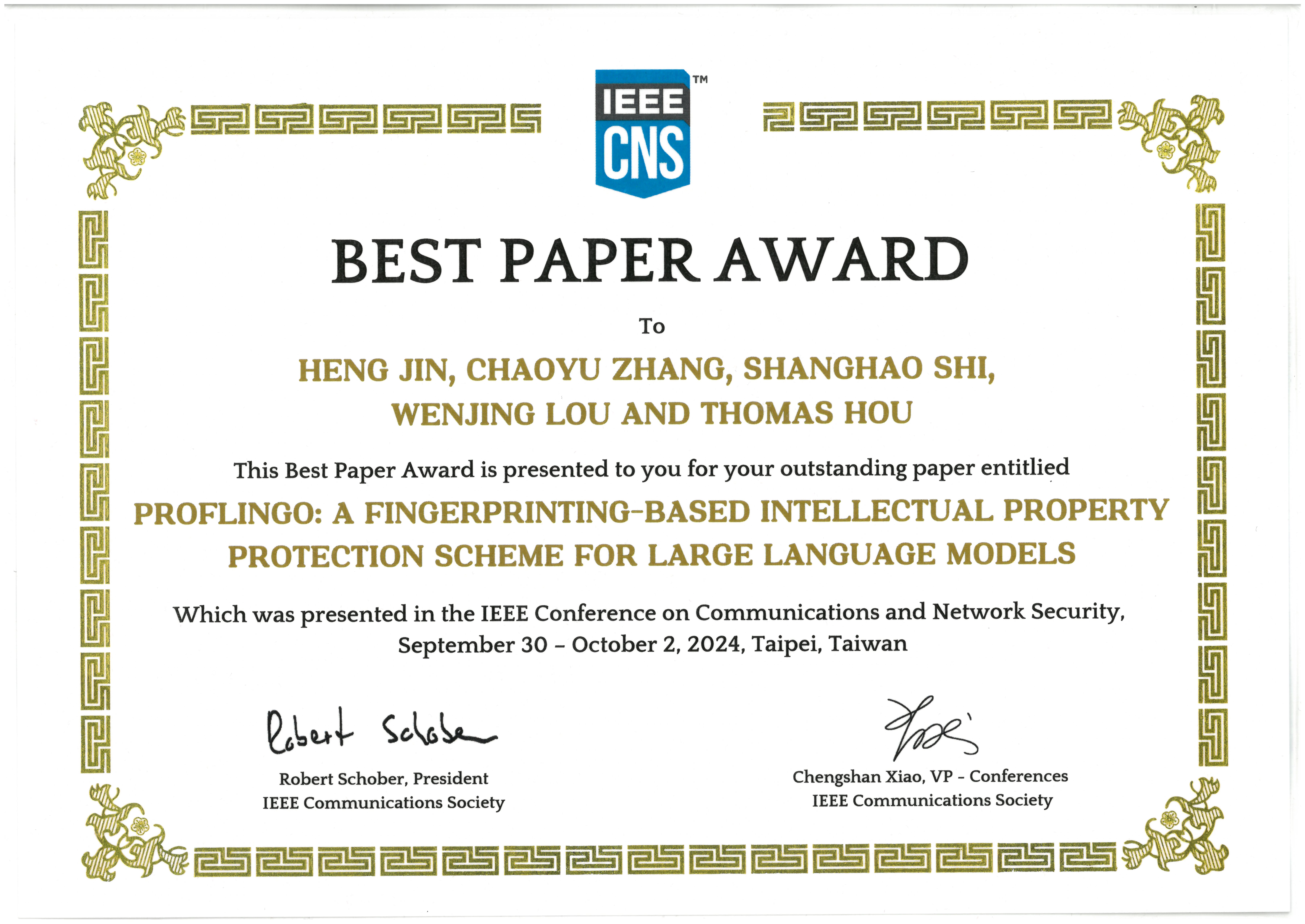 - [Aug. 2024] Our paper ‘ProFLingo: A Fingerprinting-based Intellectual Property Protection Scheme for Large Language Models’, won best paper award at the IEEE Conference on Communications and Network Security 2024 (CNS 2024).